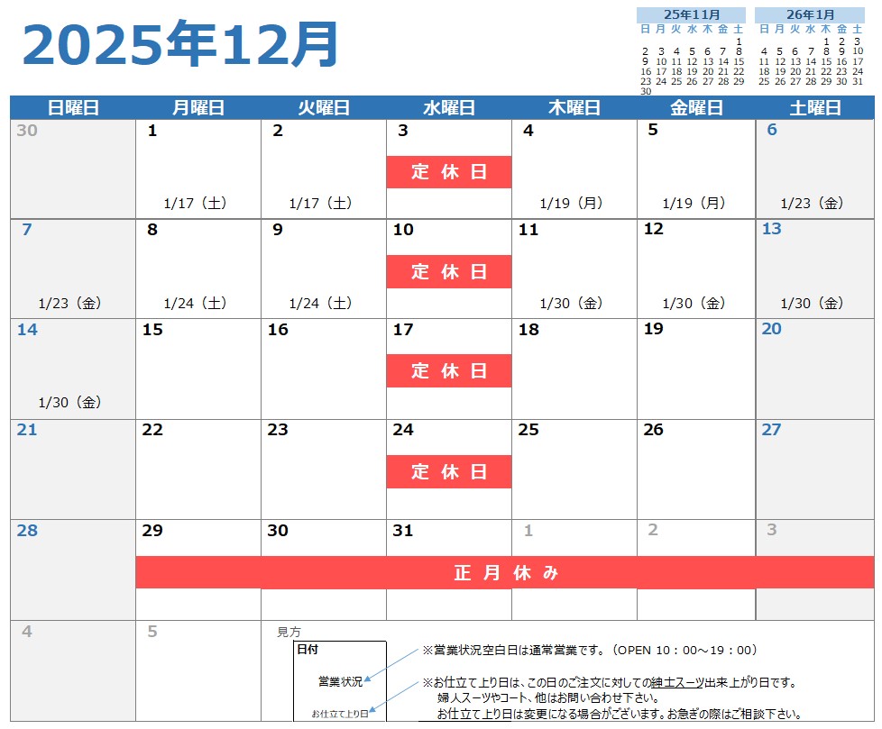 12月営業日&お仕立上り日カレンダーでございます。