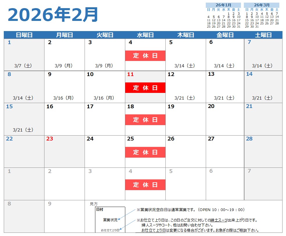※お仕立て上り日は、この日のご注文に対しての紳士スーツ出来上がり日です。婦人スーツやコート、他はお問い合わせ下さい。
