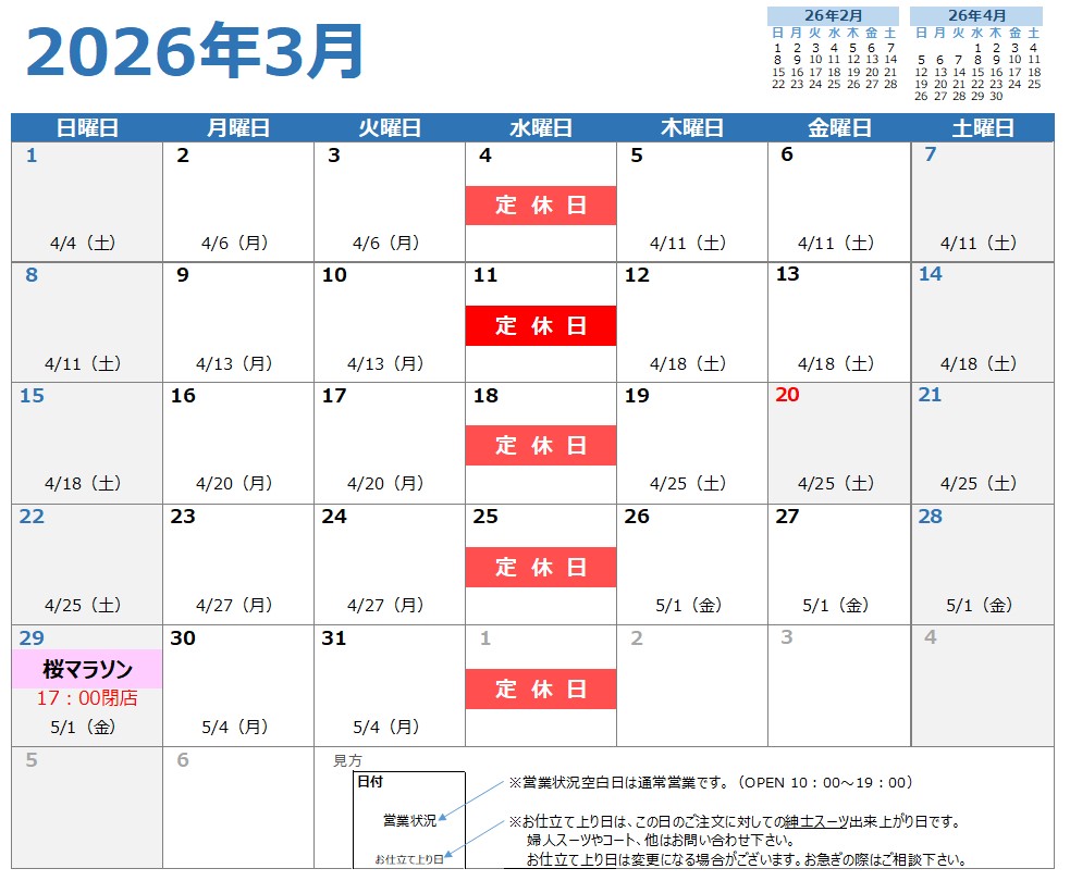 3月営業日&お仕立上り日カレンダーでございます。