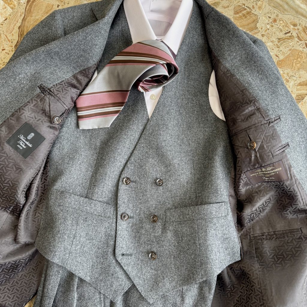今回ご紹介するスーツは、表面が起毛してふんわりのフランネル生地で仕立てた、グレーフランネルスーツです。